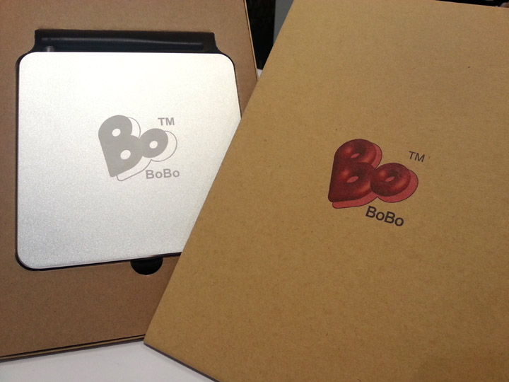 BoBo Nano PC is protected by a triangular shape gift box containing the power adapter and HDMI cable.