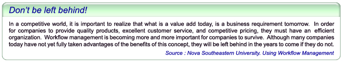 Example of applications: 1. Purchase requisition and approval 2. Insurance underwriting processes 3. Staff recruitment process 4. Source inspection system 5. Sales order processing 6. ISO9000 and regulatory compliance 7. Expenses Reimbursement 8. Paperless Recruitment System