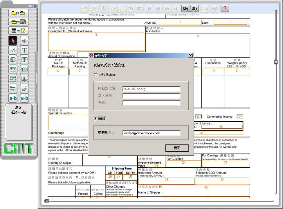 Some service providers suggested customers to use shipping software system to resolve similar problem. These software systems may cost over HK$1 million. SME may not be able to afford and utilize such complex system. Clever Motion Technology invented our own form flow solution. It facilitates and automates from Shipper's Instruction at customer end till bill of lading and airway bill. The saving is more than 50% and the error will be approaching to zero. Through our special software tool (see Figure 1), it will take less than 10 minutes to convert a normal paper form to e-Form. The processing, look and feel is same as original form. There is no need to be learned and trained.