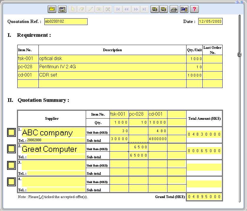 In most of the large corporations, purchasing procedure may require 3 quotations for comparison. Each department has to obtain the information and consolidate for centralized purchase. Of course, you may use spread sheet and macro formula. It will be very time consuming and not flexible. Normal staff may not be capable to handle it. There is a simple method. Figure 6 is a complex e-Form. It can handle addition and multiplication. The server will be used to consolidate the data. If you want to prepare graphic chart, the export function enable you to transfer to CSV format (see Figure 7). This is more efficient and effective. The cost of the software is affordable.